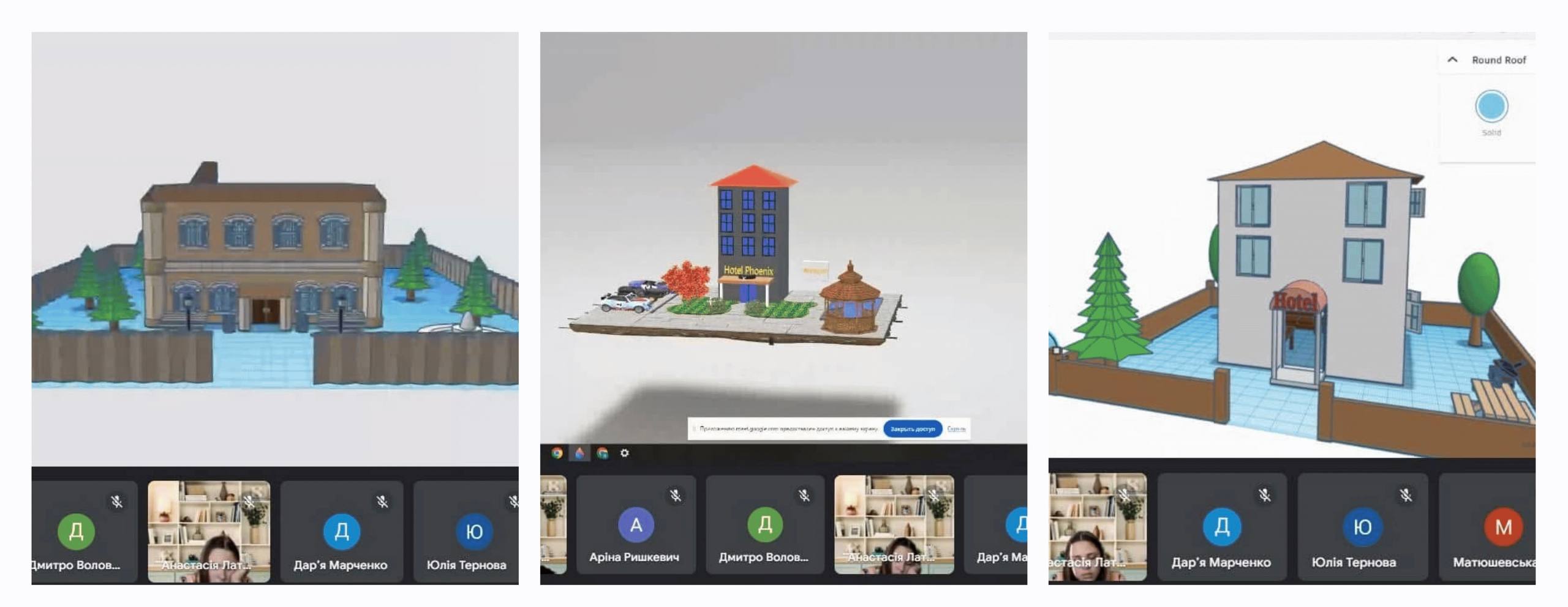 Студенти презентували власний досвід з проєктування 3D моделей на тему «Побудова готельного комплексу» за допомогою платформ Tinkercad, SketchUp та Paint 3D, а також учасники переглянули відео за результатами відвідування центру цифрової освіти та медіакультури «Інтерв’ю студентів».